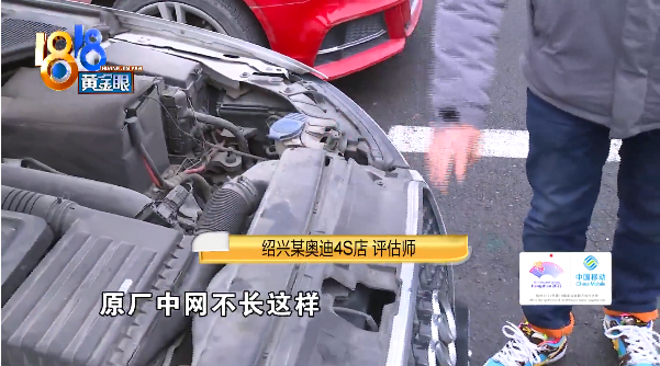绍兴某奥迪4S店 评估师:进气肯定改过,然后中网也是换过的,原厂中网不长这样。这边螺丝都拧过,叶子板这块是更换过的,(挡风玻璃和机盖呢)挡风玻璃看日期,(机盖)这边用漆膜仪测过,数值是比较高的,说明油漆做过。(这个大梁什么的,有没有问题)大梁的话,用手电筒照一下,目前来看是没问题的,如果焊接的话,是很明显的,这边看是没啥问题。也不算特别大的事故,但事故也不小,这辆车出入应该在万把块钱左右。
