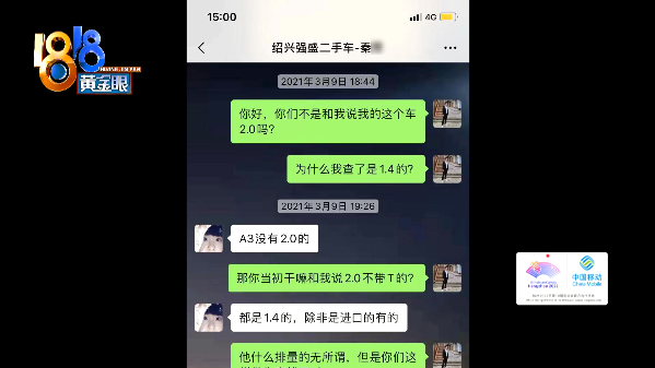 去年3月9号,施先生质疑说“你们不是和我说这个2.0吗?为什么我查了是1.4的”对方回复:“A3没有2.0的”,1月24号,他也和对方微信沟通了。施先生认为,这足以证明买卖关系。