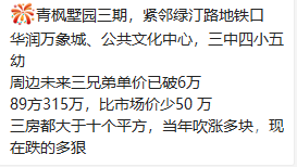 就在今天,1月26日,又有一套价格更低的房源挂了出来:青枫墅园三期,紧邻地铁口,89方315万,折合单价约3.5万/方。