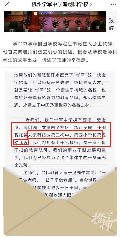 原来,早在2020年9月,学军中学海创园学校的一篇微信推文中,提到了“学军中学教育集团将托管未来科技城第三初中、第四小学和第五幼儿园”。