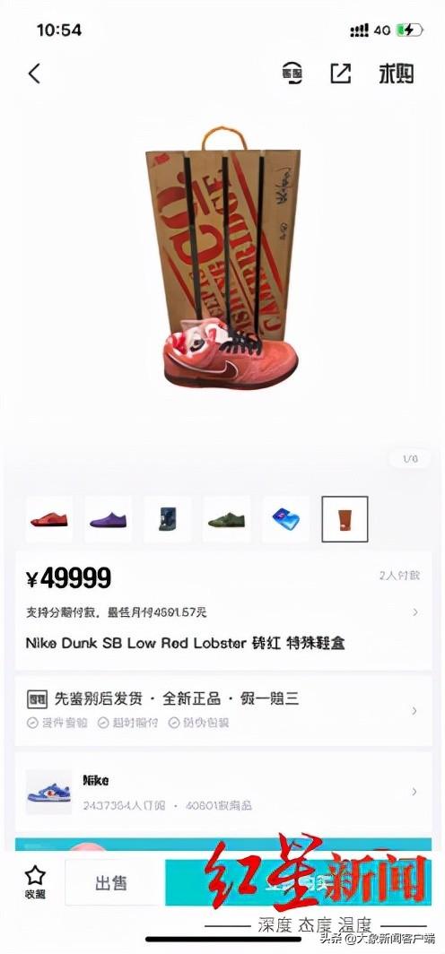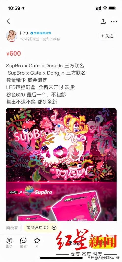 一位卖家向记者透露,“这款联名鞋盒是展会发售,目前在市面上很难买到,我现在也只有两个。”经过沟通,记者得知,其中有一个鞋盒是有瑕疵的。但卖家说,这并没有影响到顾客的热情,仍然不断有人来问价,有高价购买存在瑕疵鞋盒的意愿。