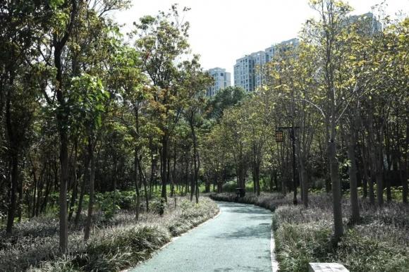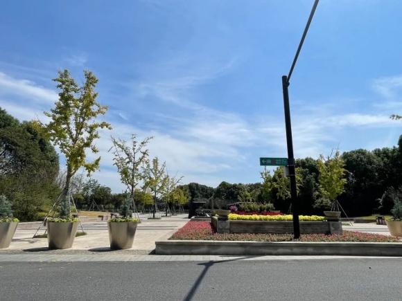 江东一路与青六北路交叉口,星央悦府和钱塘区政府南侧的一片扇形公园