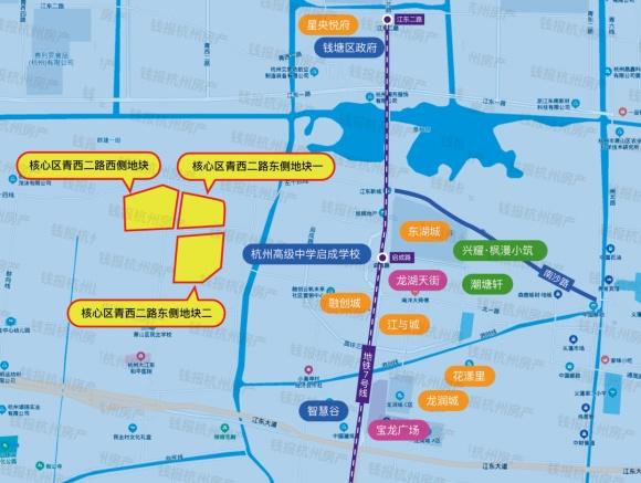 沿着主干道青六路往北,在东湖公园西北侧是新的钱塘区政府所在,地铁7号线江东二路站直达,西面紧邻着卓越·星央悦府、钱塘区规划展示馆。