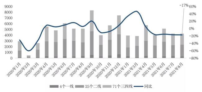 2021年三季度,全国新房成交由二季度“由稳转跌”趋势进一步下行,至8月百城商品住宅成交规模连续4个月缩减,单月较2020年和2019年同期降幅扩大至22%和12%,连续6个月缩减。