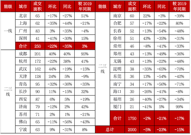 具体城市而言,重点城市保持较高市场热度,厦门、成都、合肥、济南、杭州和长沙成交面积较2019年同期上涨30%以上;武汉、西安、苏州、南京规模环比再增。部分城市楼市下行压力加大,如南宁、昆明、长春、福州等市场动能明显转弱,规模同环比及较2019年同期均有不同幅度下降。