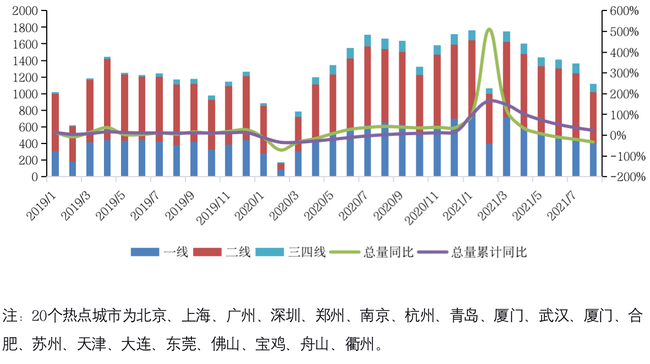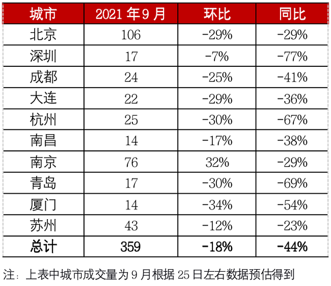 9月,28个重点城市预计成交面积约2000万平方米,“金九”销售表现冷淡收场,同环比齐跌,环比降5%,较2020年和2019年同期分别降23%和15%。
