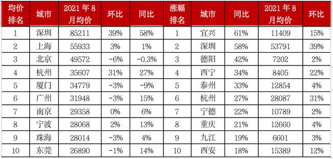 表:2021年8月105个典型城市商品住宅成交均价和价格涨幅前10(单位:元/平方米)