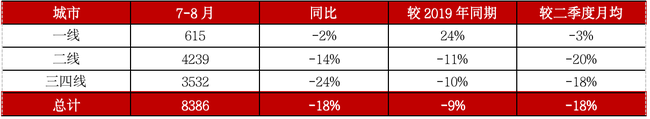 7-8月,全国100个重点城市商品住宅成交面积8386万平方米,较2020年和2019年同期分别下降18%和9%,月均成交面积相较二季度下降18%。其中,三四线下行加剧,24%的跌幅超百城平均。二线城市中,轮动与分化现象在三季度愈发凸显,此前沿海高热城市受政策调控作用明显降温,小部分区域中心城市则初见翘尾行情。