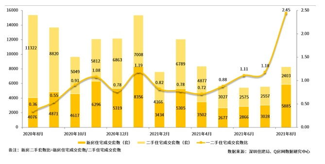 4月以来,深圳一二手住宅成交套数比持续攀升,8月该比例更是“窜到”2.45。