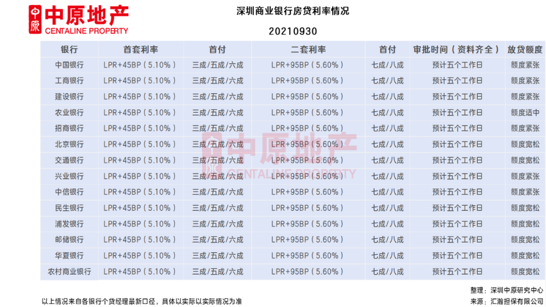 与此同时,楼市资金面还在持续收紧。深圳中原指出,目前包括建行在内的6家银行放贷额度由宽松调整为紧张,农行额度由宽松调整为适中。深圳各大银行房贷正常接受业务申请、办理,住房贷款资格审核严格。各大行房贷利率基本统一,首套利率上浮45BP,二套利率上浮95BP。