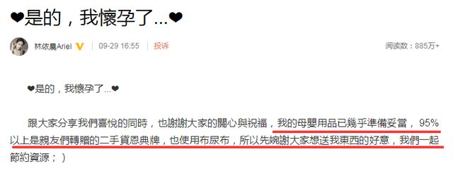 在这个官宣长文中,林依晨特别提到,母婴用品已经准备妥当,这些母婴用品中有95%以上都是亲友转赠的“二手货”,借此呼吁大家一起节约资源。