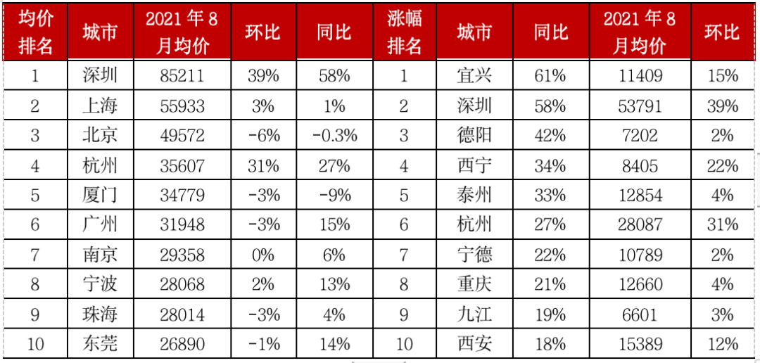 表:2021年8月105个典型城市商品住宅成交均价和价格涨幅TOP10(单位:元/平方米)