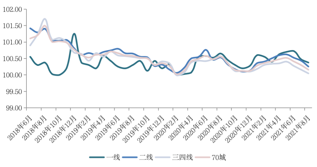 图:2018年6月至2021年8月70个大中城市房价指数环比变化