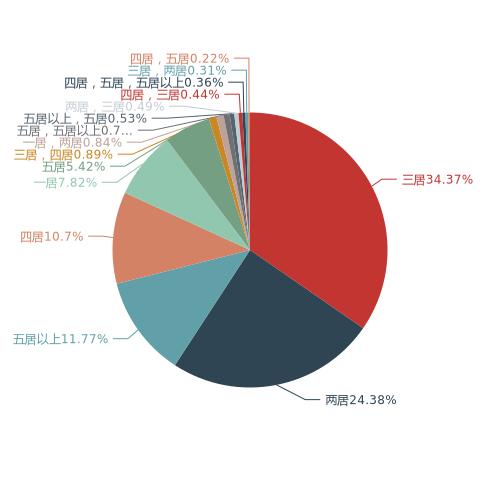 在户型的关注度上,三居是网友关注的户型,搜索占比为34.37%;其次为两居占比为24.38%;五居以上搜索占比11.77%。