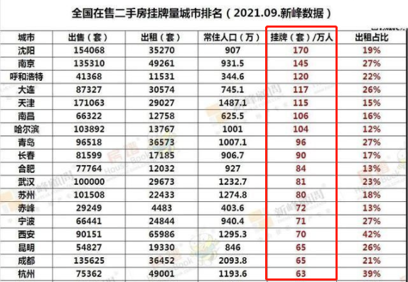 目前在售二手房数量三甲城市:天津171063套,重庆165752套,沈阳154068套,但是绝对存量≠绝对压力,还要看常住人口基数(需求池),即每万人常住人口挂牌量,三甲城市分别为:沈阳170套/万人、南京145套/万人、呼和浩特120套/万人。
