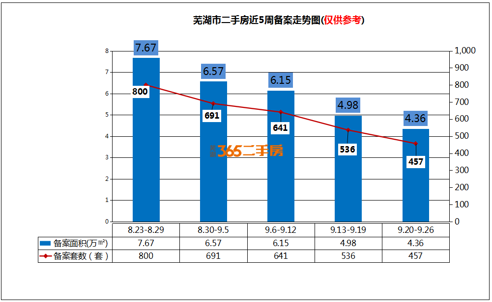 据芜湖房地产交易信息网显示,9月20日—9月26日,芜湖二手房备案约457套,备案面积约4.36万㎡。(注:数据正在处理,目前仍按照区划调整前各区域统计。)