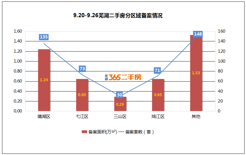 分区域来看,芜湖二手房各区域备案情况如下:镜湖区二手房备案135套,共计面积约1.24万㎡;弋江区二手房备案73套,共计面积约0.65万㎡;鸠江区二手房备案71套,共计面积约0.65万㎡;三山区二手房备案30套,共计面积约0.65万㎡;其他区域合计备案148套,共计面积1.53万㎡。