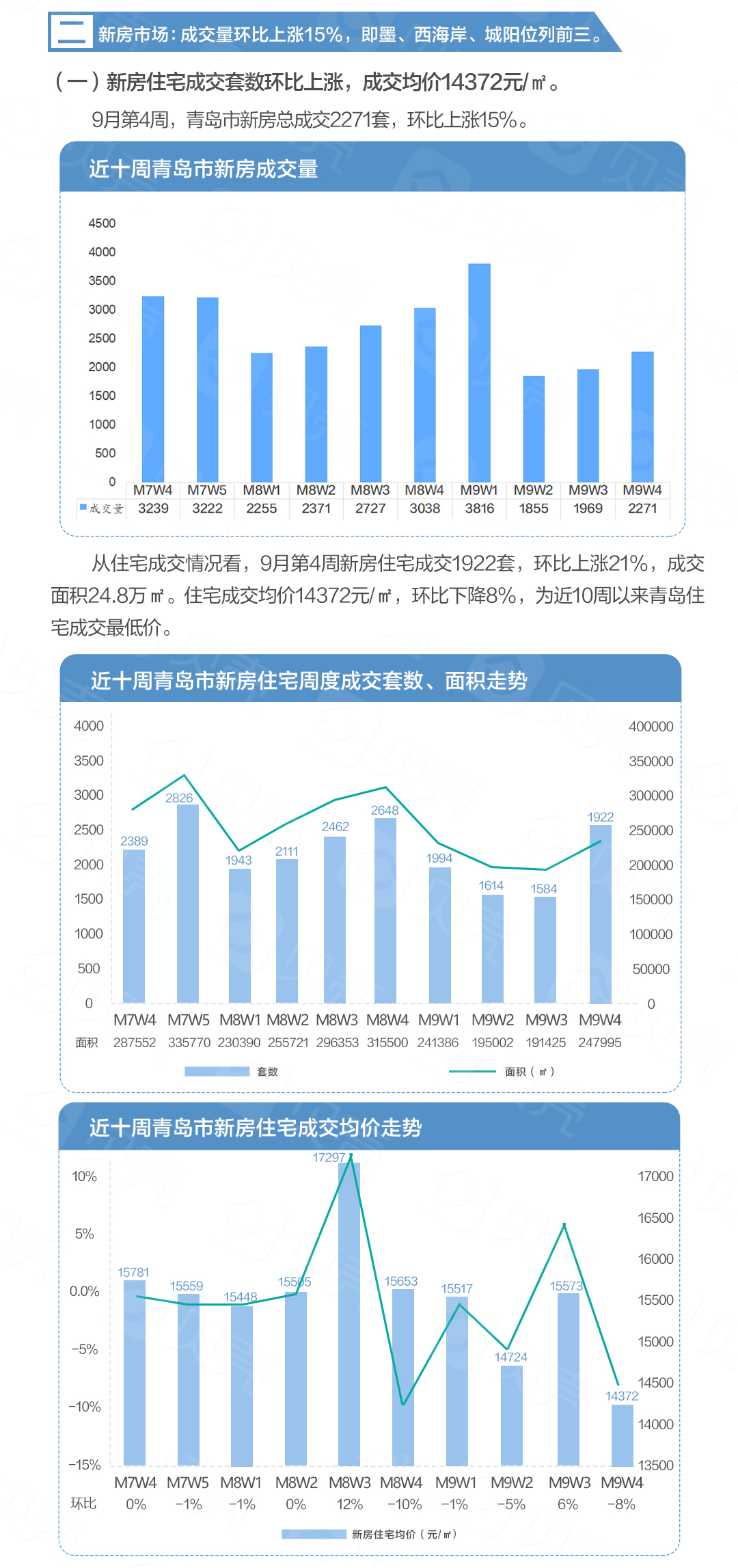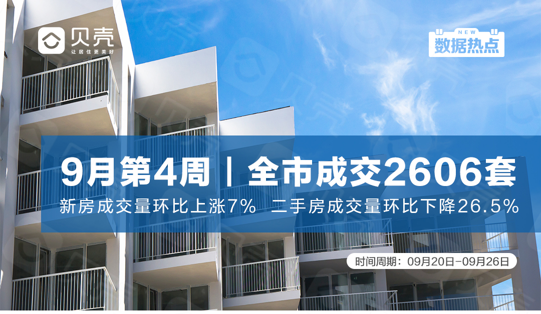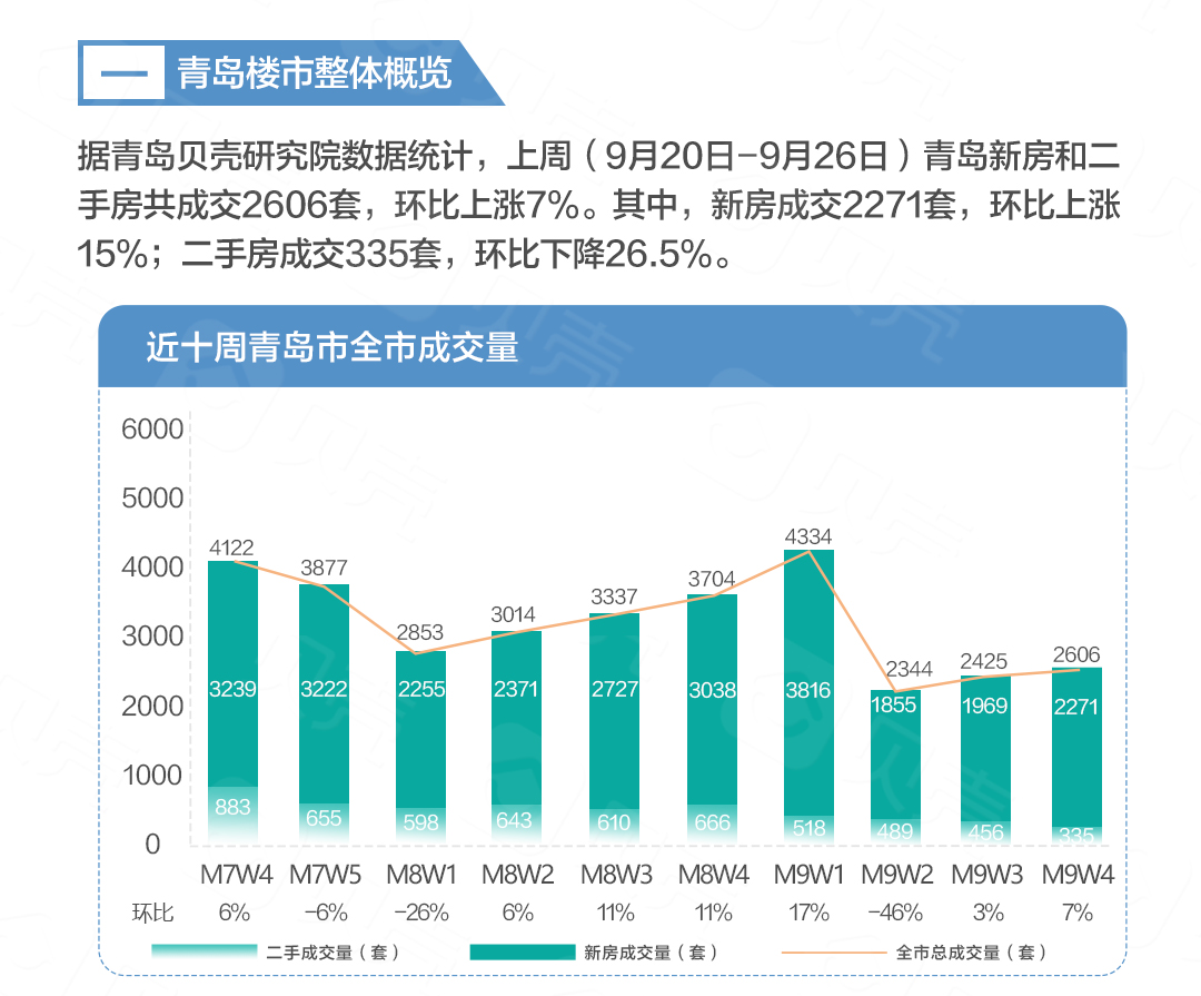 据青岛贝壳研究院数据统计,上周(9月20日—9月26日)青岛新房和二手房共成交2606套,环比上涨7%。其中,新房成交2271套,环比上涨15%;二手房成交335套,环比下降26.5%。