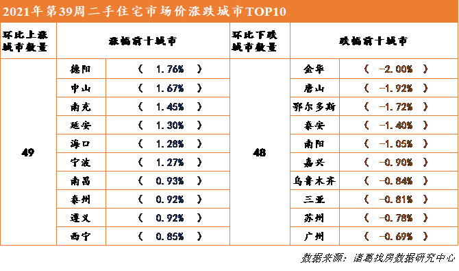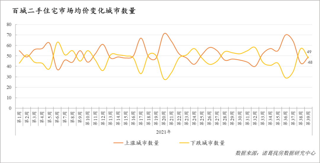 2021年第39周百城二手住宅市场均价上涨的城市数量为49个,较上周增加6个,平均涨幅为0.45%,涨幅再度收窄0.04个百分点;下跌的城市数量为48个,较上周减少9个,平均跌幅为0.45%,与上周相比扩大0.02个百分点;持平城市数量为3个,较上周增加3个。本周市场价格上涨城市数量略有增加,但整体变化不大,同时涨跌幅波动甚微。整体来看,在政策调控力度不断升级下,今年“金九银十”销售旺季不甚显著,市场热度略有不足。