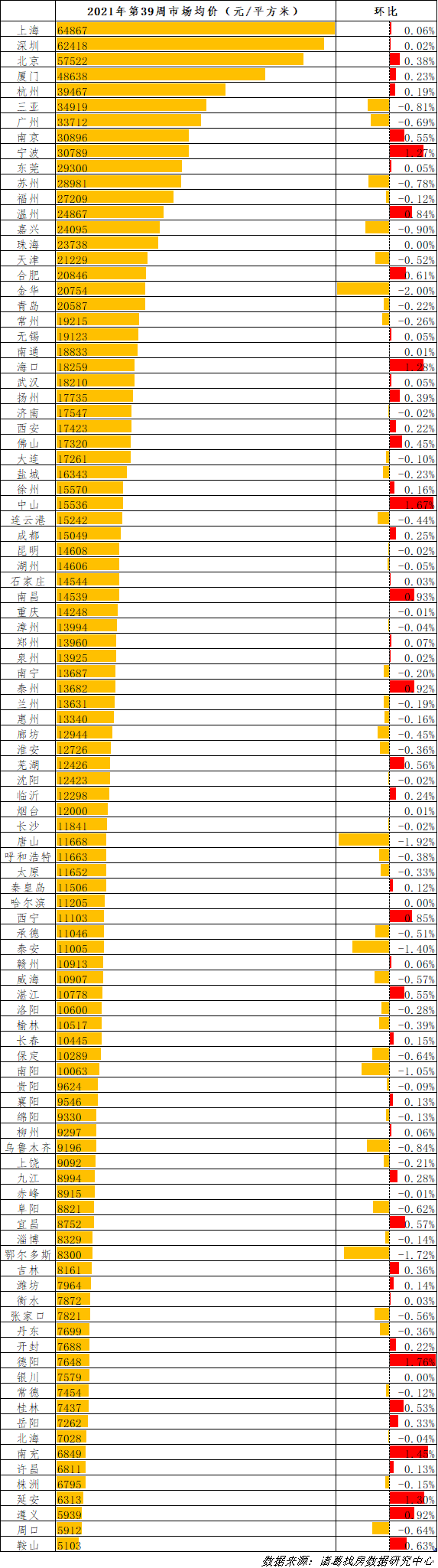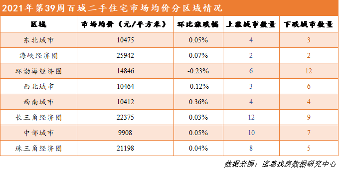 分区域来看,2021年第39周仅环渤海经济圈和西北城市市场均价下跌,其余区域市场均价均上涨。市场均价上涨区域中,西南城市本周市场均价为10412元/平方米,环比上涨0.36%,位居涨幅首位;其次为海峡经济圈,环比涨幅为0.07%,位居涨幅第二;东北城市和中部城市本周市场均价分别为10475元/平方米和9908元/平方米,环比涨幅均为0.05%,并列位居涨幅第三。市场均价下跌区域中,环渤海经济圈本周市场均价为14846元/平方米,环比下跌0.23%,位居跌幅首位;西北城市次之,环比跌幅为0.12%,位居跌幅第二。