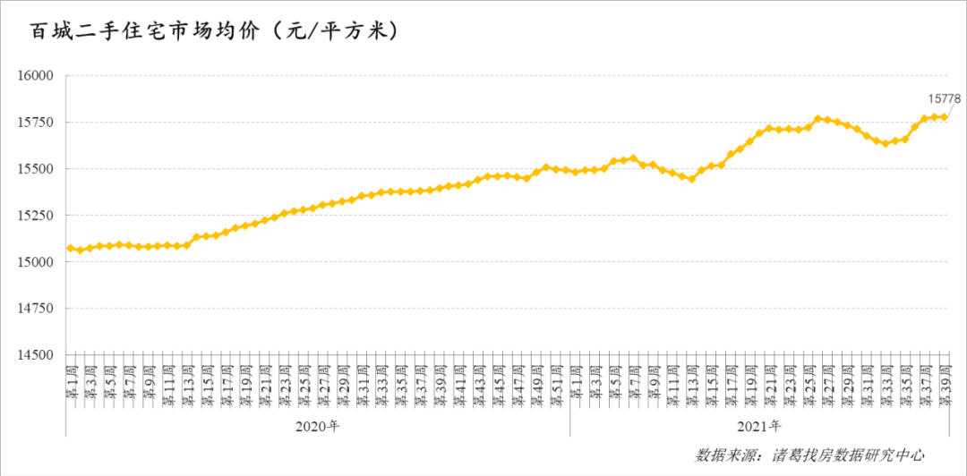据诸葛找房数据研究中心监测数据显示,2021年第39周百城二手住宅市场均价为15778元/平方米,与上周持平。随着市场迈入2021年下半场,中央重申“房住不炒”原则,政策调控重点在二手房市场发力,多城跟进二手住宅参考价机制,促使价格虚高房源下架,同时政策调控全方位进行,逐步规范二手房市场,有力打击市场虚热现象,自27周起市场均价连续7周呈现下行态势,进入8月中旬以来,前期政策调控效应有所减弱,二手房市场亦在政策调控下逐渐趋于稳定,并产生一定的免疫作用,叠加市场迈入“金九银十”楼市旺季,市场热度略有提升,市场均价自34周起连续5周呈现上升趋势,本周与上周持平。整体来看,在“人房地钱”的联动机制下,“房住不炒”长效机制持续推进,同时城市“限涨令”与“限跌令”双向管控,致使二手房市场平稳运行态势延续。