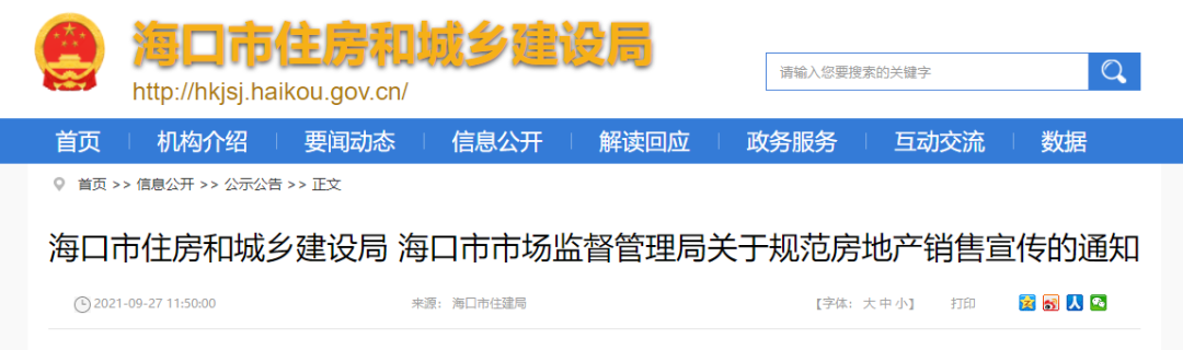 ▲海口市住房和城乡建设局官网截图《通知》明确,房地产开发企业及房地产营销代理机构的房地产销售广告不得含有为入住者办理户口、升学等事项的承诺;不得明示或者暗示购买者可以入读、划片入读某特定中小学,不得使用引发购房者对特定中小学入学资格产生误解的特定用语;不得对规划和建设中的文化教育设施作误导宣传,涉及在规划或者建设中的文化教育设施应当明确注明“在规划中”或者“在建设中”。